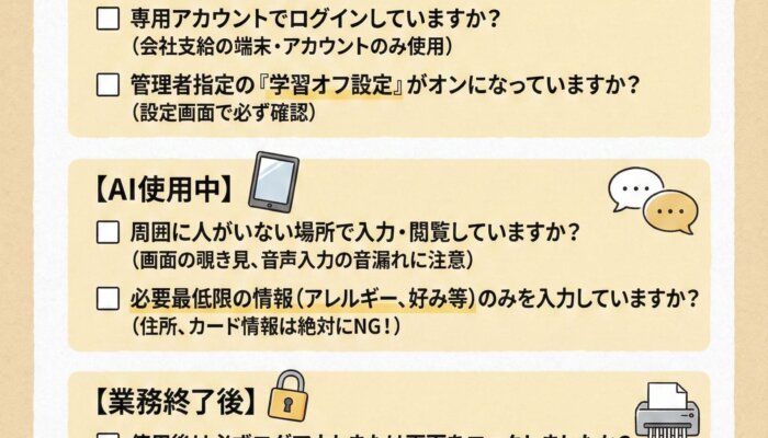 「もしお客様の名前や住所が、AIの学習データとして外に漏れてしまったら……」 そんな不安が、デジタル化へのブレーキになっていませんか?確かに、初期設定のままAIを使うことは、公共の場所に情報を置くようなリスクを孕んでいます。 しかし、AIには必ず「ここから先は秘密にしてください」と伝えるための「学習オフ(オプトアウト)」という設定が存在します。この設定を最初に行うだけで、AIは「外部へ情報を漏らさない、あなた専用の優秀な秘書」へと変わります。 スタッフ全員が安心してデータを扱えるよう、まずは管理者がこの「鍵」をかける手順をマスターしましょう。【