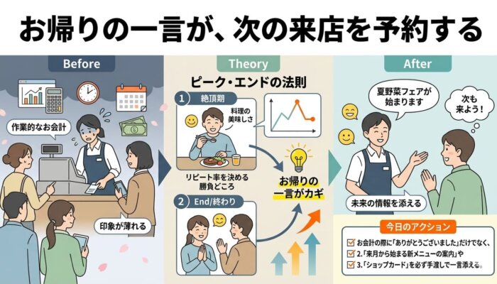2026.02.20 飲食店の週末の「戦場」を「劇場」に変える 金曜日のピーク時は殺気立ちやすいもの。 しかし、飲食店はお客様にとって非日常を楽しむ場所です。 「飲食店は地域を元気にする拠点」という言葉を胸に、忙しさを「苦労」ではなく「パフォーマンス」として楽しみましょう。 あなたの活気が、お客様の元気になります。 今日のアクション: 忙しい時こそ、スタッフ同士で「楽しもう!」と声を掛け合い、笑顔のトーンを上げる。 本文の著作権は当社に帰属しており、複製、転載、転用は厳しく禁じています。 本文の一部または全部を他のウェブサイトや印刷物、電子媒体などへ複製、転載、転用することはできません。 複製、転載、転用した場合、法的措置を取る可能性があります。 春の「出会い」を呼び込む求人を 前の記事 スタッフのミスに苛立ったら… 次の記事