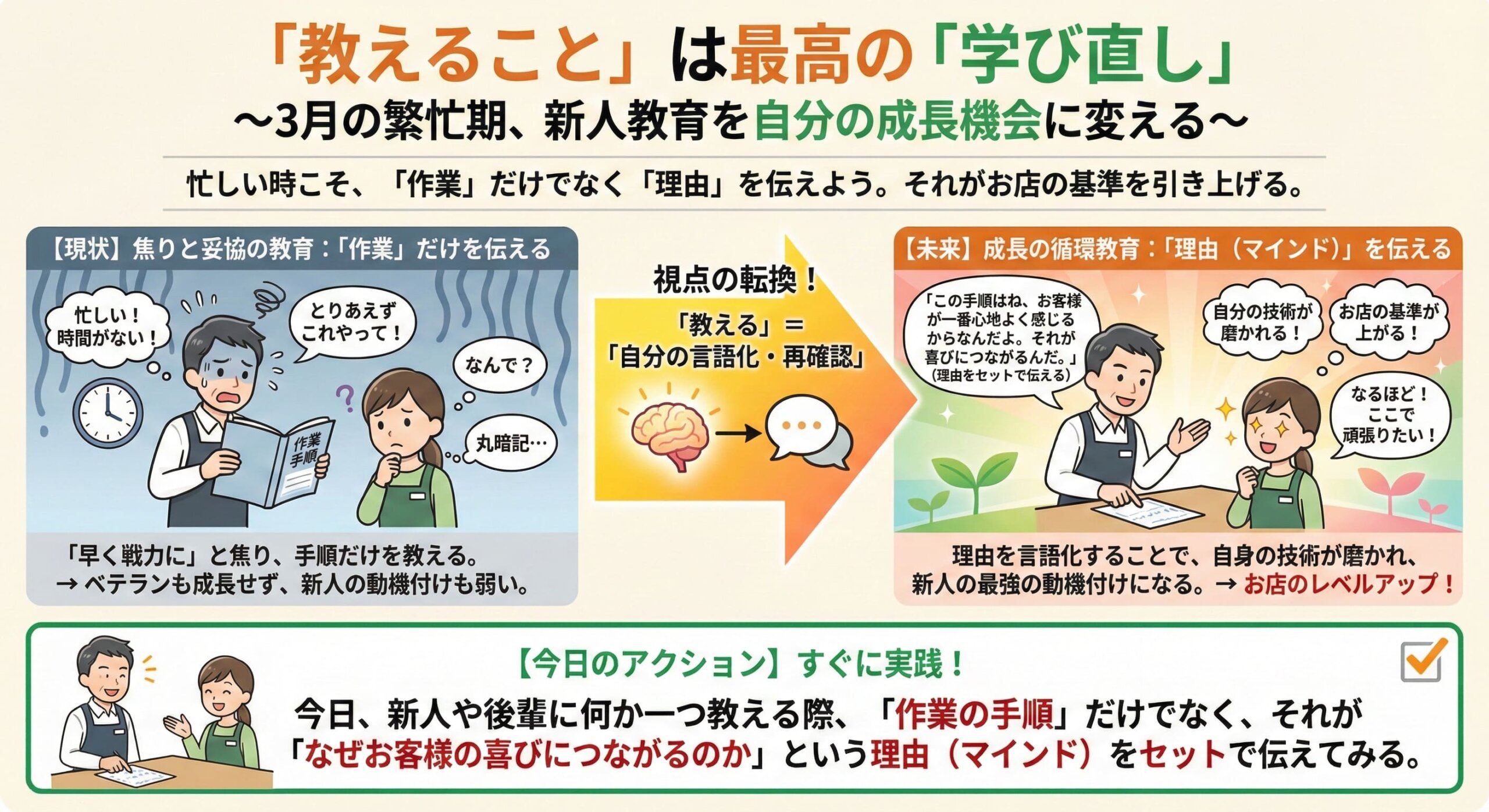 今日のアクション: 今日、新人や後輩に何か一つ教える際、「作業の手順」だけでなく、それが「なぜお客様の喜びにつながるのか」という**理由(マインド)**をセットで伝えてみる。