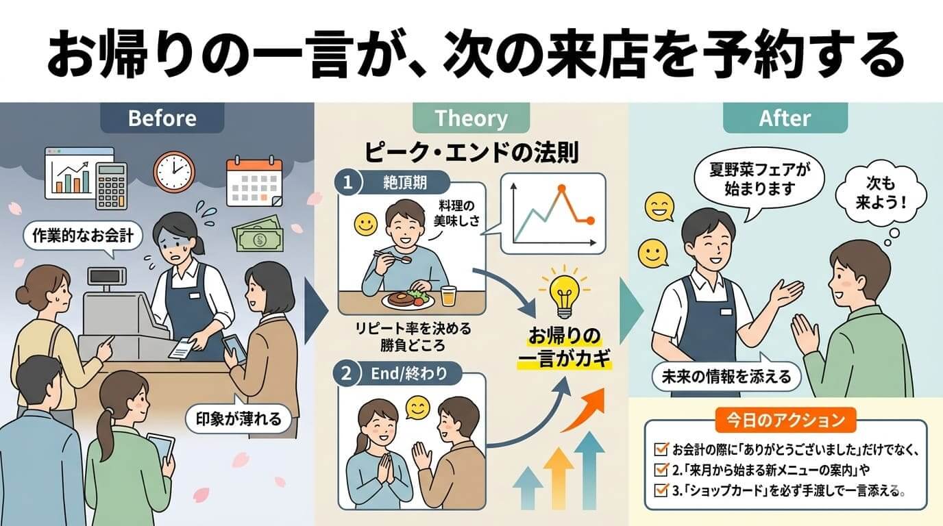 お帰りの際に、お客様の今日の満足を確認し、さらに「来月からは限定の夏野菜フェアが始まります」といった未来の情報を添えることで、お客様の脳内に「次の予約」が自然と書き込まれます。