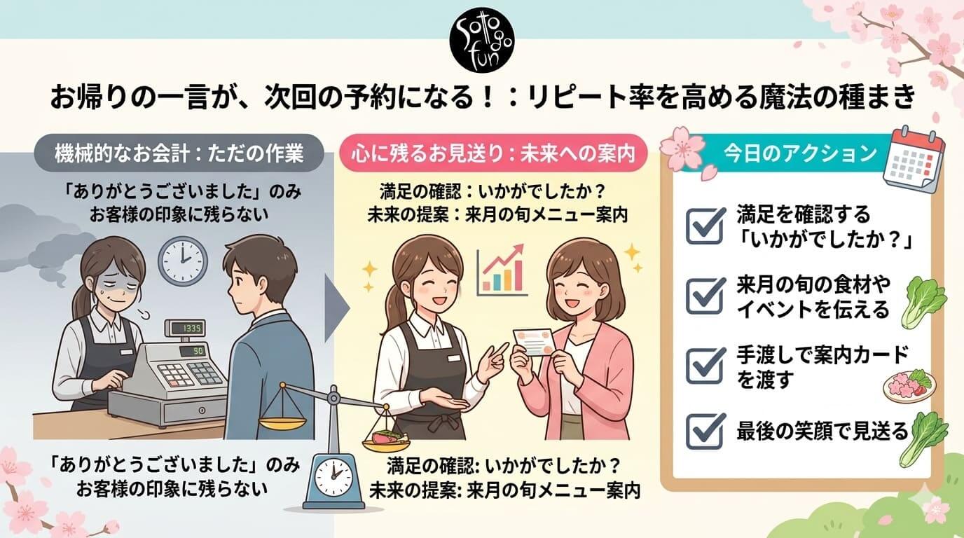 今日のアクション: お会計の際に「ありがとうございました」だけでなく、「来月の旬の食材」や「イベントの案内」を、手渡しで一言添えて伝えてください。