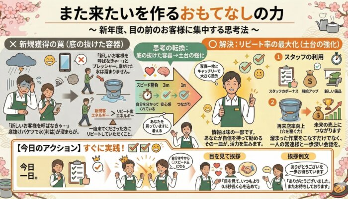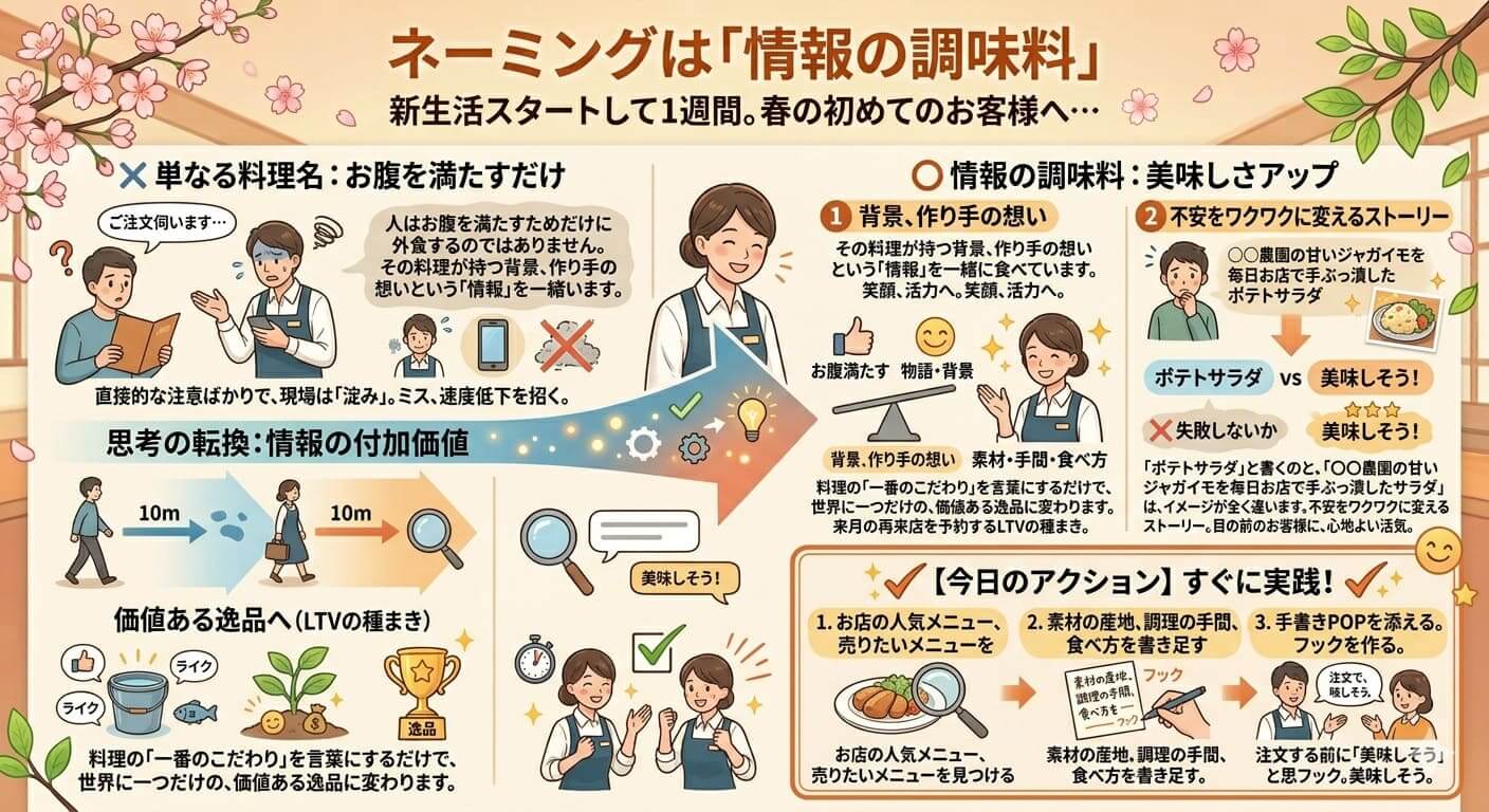 今日のアクション: お店の人気メニュー、あるいは今一番売りたいメニューに、「素材の産地」「調理の手間」「おすすめの食べ方」のいずれか一言を書き足した手書きPOPを添える。お客様が注文する前に「美味しそう!」と思えるフックを作りましょう。