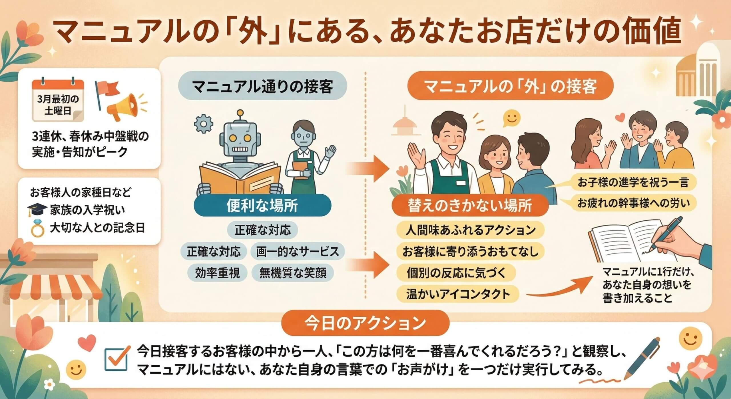 今日のアクション: 今日接客するお客様の中から一人、「この方は何を一番喜んでくれるだろう?」と観察し、マニュアルにはない、あなた自身の言葉での「お声がけ」を一つだけ実行してみる。