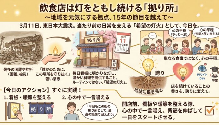 今日のアクション: 今日一番多く行う作業(挨拶、バッシング、ドリンク作成など)を一つ選び、それを「初めて行う仕事」のような新鮮な気持ちで、丁寧かつスピーディーに完結させてみる。
