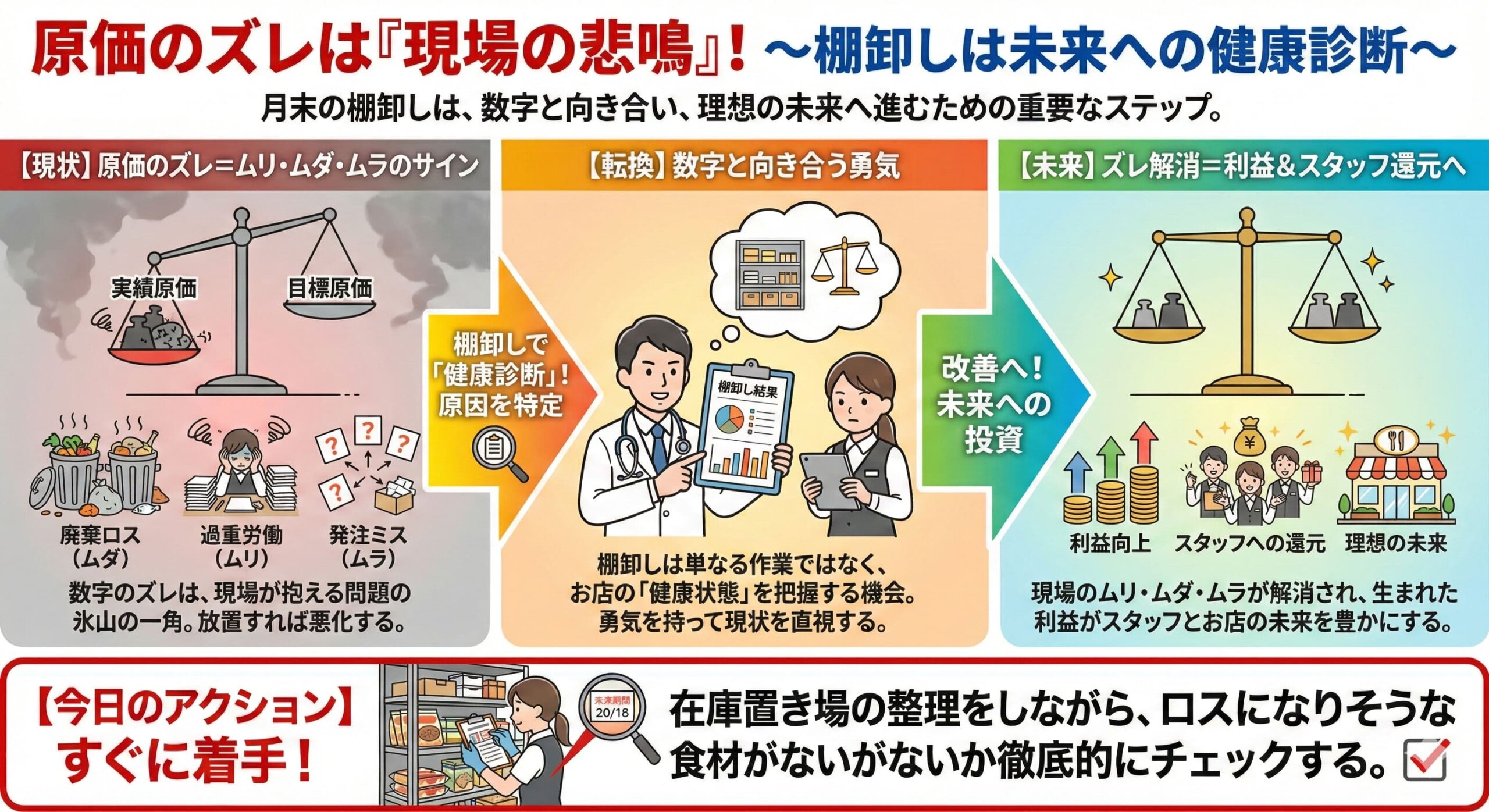 2026.02.22 原価のズレは、現場のムリ・ムダ・ムラのサイン 月末に向け、棚卸しの準備を。 棚卸しは単なる作業ではなく、理想の未来へ進むための「健康診断」です。 原価のズレは、現場のムリ・ムダ・ムラのサイン。 数字と正面から向き合う勇気が、来月の利益とスタッフへの還元を生み出します。 今日のアクション: 在庫置き場の整理をしながら、ロスになりそうな食材がないか徹底的にチェックする。 本文の著作権は当社に帰属しており、複製、転載、転用は厳しく禁じています。 本文の一部または全部を他のウェブサイトや印刷物、電子媒体などへ複製、転載、転用することはできません。 複製、転載、転用した場合、法的措置を取る可能性があります。 スタッフのミスに苛立ったら… 前の記事
