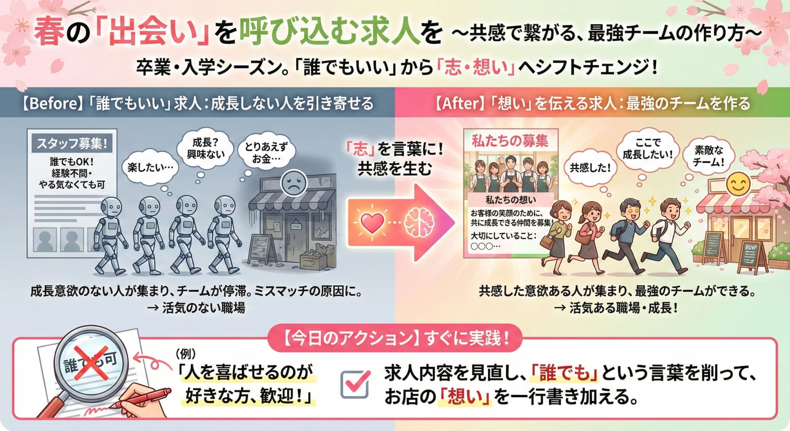 2026.02.19 春の「出会い」を呼び込む求人を 卒業・入学シーズンを前に、求人準備を始める時期です。 「誰でもいい」という募集は、成長したくない人を引き寄せます。 あなたのお店が何を大切にし、どんな人と働きたいか? その「志」を言葉にしてください。 共感こそが最強のチームを作ります。 今日のアクション: 求人内容を見直し、「誰でも」という言葉を削って、お店の「想い」を一行書き加える。 本文の著作権は当社に帰属しており、複製、転載、転用は厳しく禁じています。 本文の一部または全部を他のウェブサイトや印刷物、電子媒体などへ複製、転載、転用することはできません。 複製、転載、転用した場合、法的措置を取る可能性があります。 情報の提供も「サービス」 前の記事 飲食店の週末の「戦場」を「劇場」に変える 次の記事
