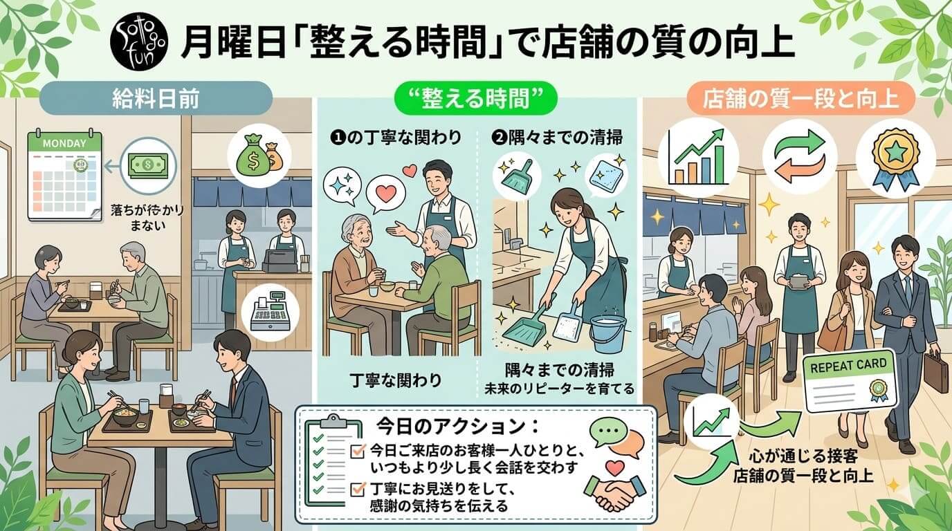 そうした「整える時間」を大切にすることで、お店の質は一段と向上します。今週も良いスタートを切っていきましょう。