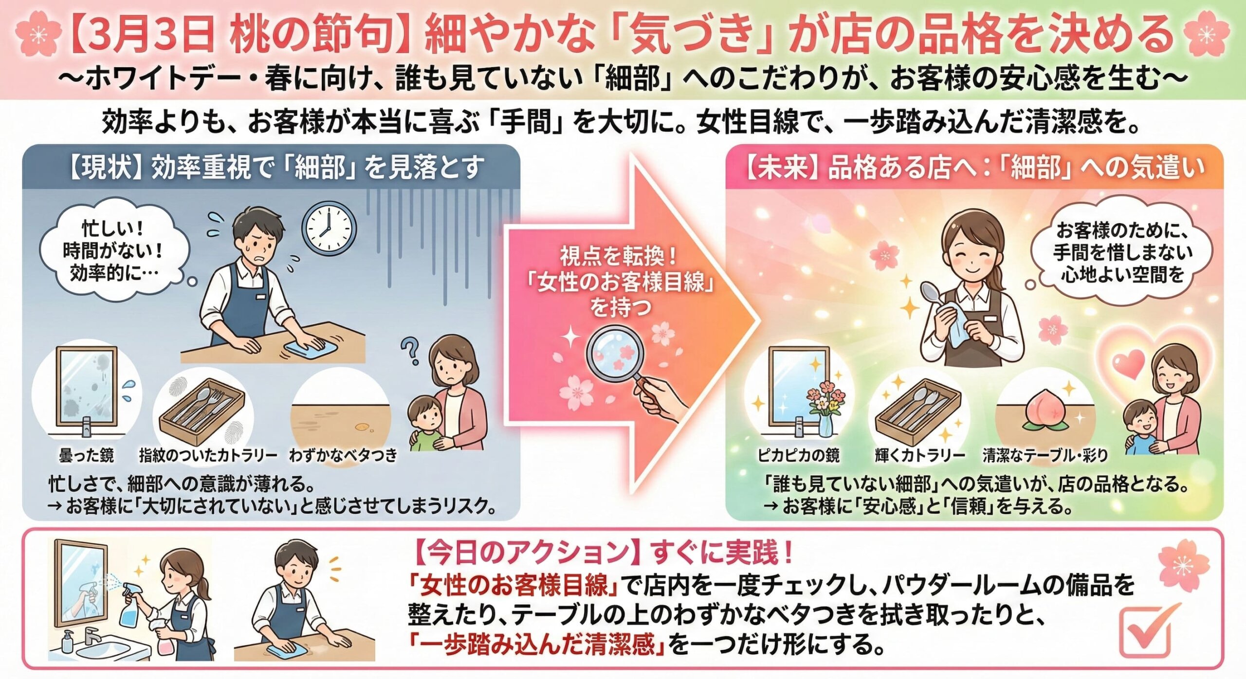 今日のアクション: 「女性のお客様目線」で店内を一度チェックし、パウダールームの備品を整えたり、テーブルの上のわずかなベタつきを拭き取ったりと、「一歩踏み込んだ清潔感」を一つだけ形にする。