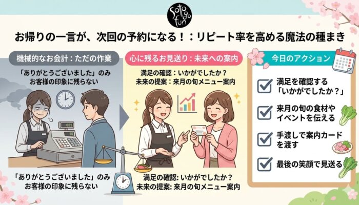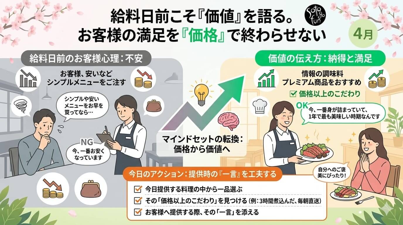 今日のアクション: 今日提供する料理の中から一品選び、その「価格以上のこだわり(例:3時間煮込んだ、毎朝直送される等)」を、お客様へ提供する際の「一言」に必ず添える。
