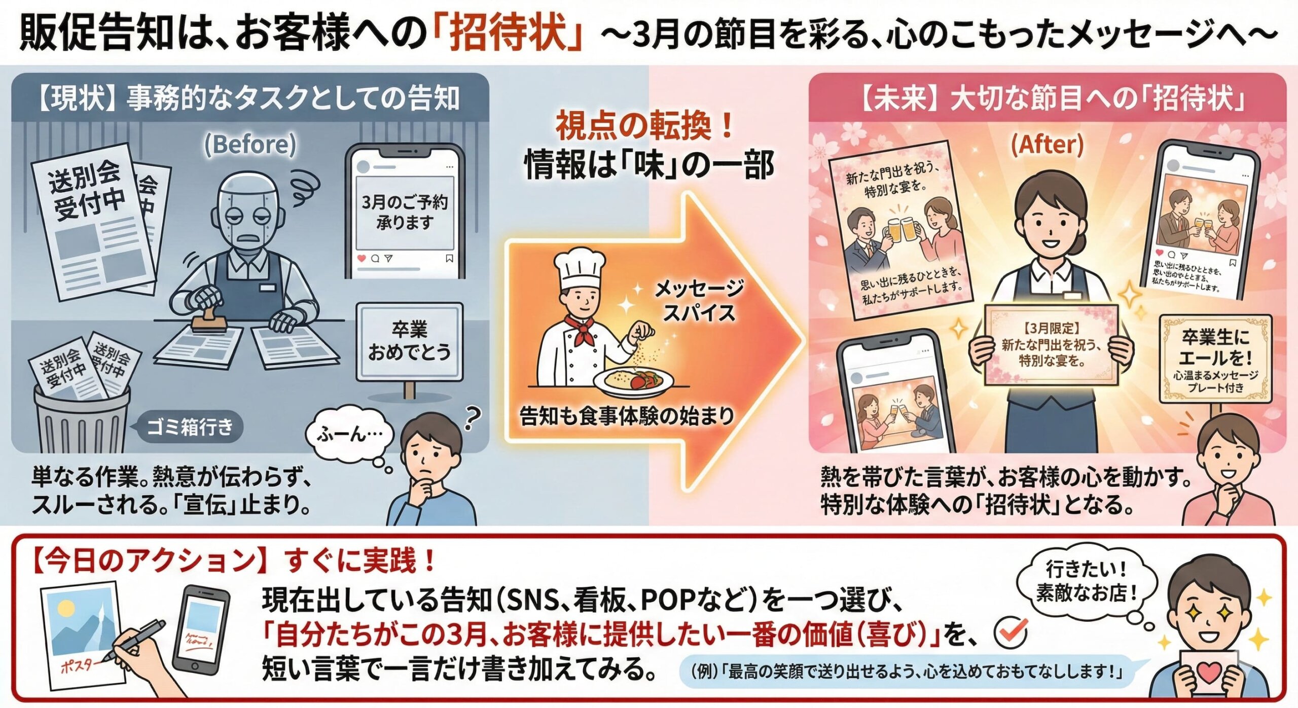 今日のアクション: 現在出している告知(SNS、看板、POPなど)を一つ選び、「自分たちがこの3月、お客様に提供したい一番の価値(喜び)」を、短い言葉で一言だけ書き加えてみる。