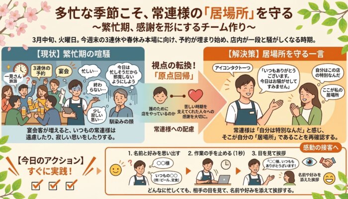 今日のアクション: 出勤してすぐ、あるいは開店前の5分間で、「お客様が一番最初に触れる場所(ドアノブ、メニューの表紙、椅子の背もたれなど)」を一つだけ、新品のような輝きになるまで磨き上げる。