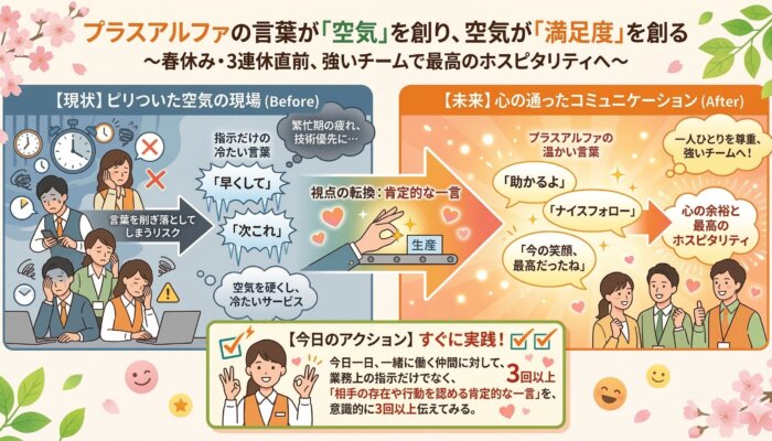 今日のアクション: 冷蔵庫やストック棚の奥をチェックし、「期限が近いもの」や「忘れられがちな端材」を一つ見つけ、それを今日の「おすすめ」や「まかない」で最高に美味しく使い切る工夫をする。