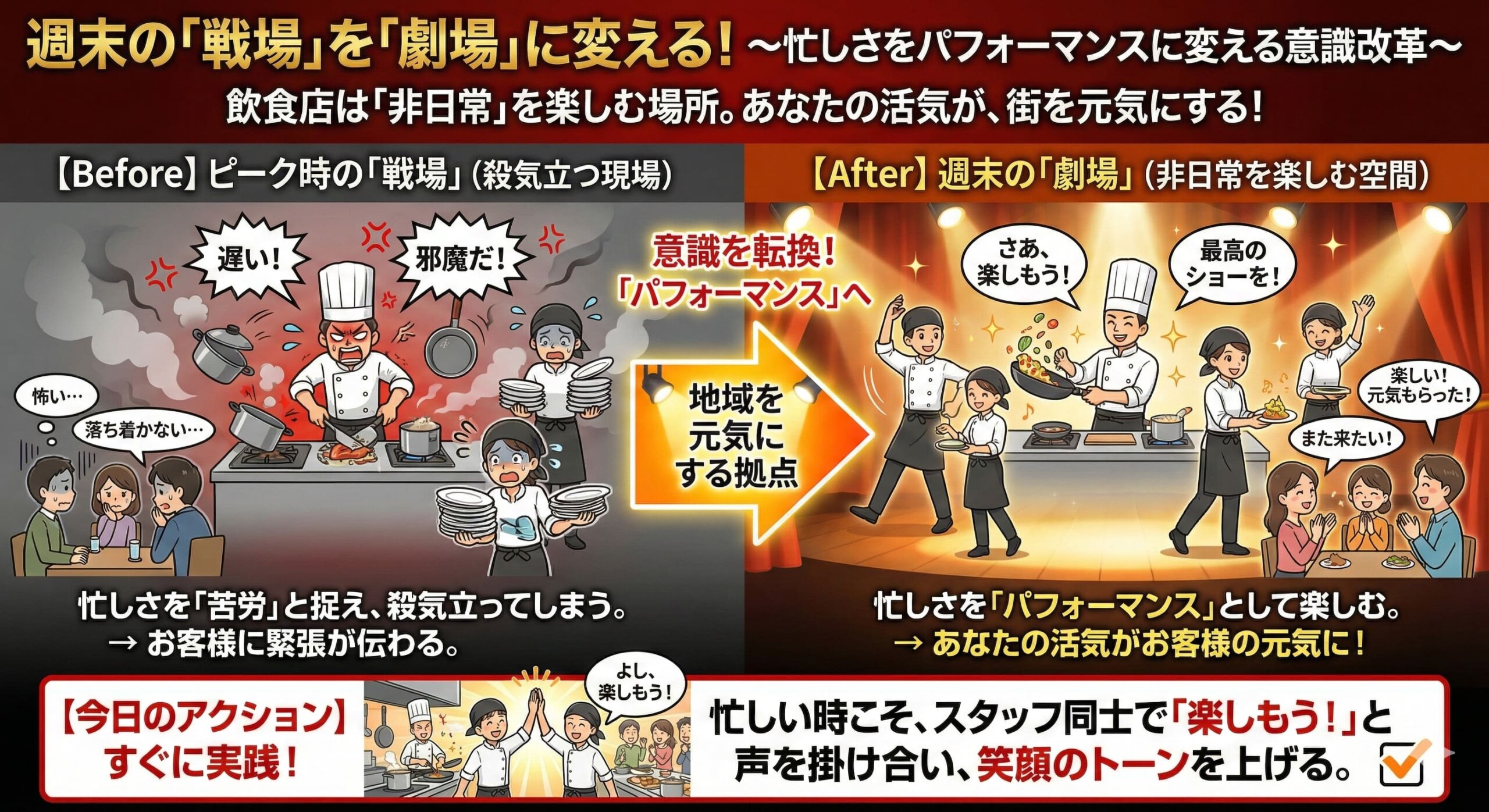 2026.02.20 飲食店の週末の「戦場」を「劇場」に変える 金曜日のピーク時は殺気立ちやすいもの。 しかし、飲食店はお客様にとって非日常を楽しむ場所です。 「飲食店は地域を元気にする拠点」という言葉を胸に、忙しさを「苦労」ではなく「パフォーマンス」として楽しみましょう。 あなたの活気が、お客様の元気になります。 今日のアクション: 忙しい時こそ、スタッフ同士で「楽しもう!」と声を掛け合い、笑顔のトーンを上げる。 本文の著作権は当社に帰属しており、複製、転載、転用は厳しく禁じています。 本文の一部または全部を他のウェブサイトや印刷物、電子媒体などへ複製、転載、転用することはできません。 複製、転載、転用した場合、法的措置を取る可能性があります。 春の「出会い」を呼び込む求人を 前の記事