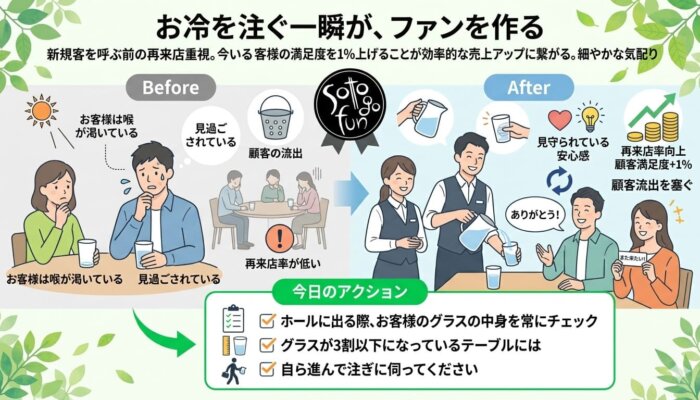 飲食店経営を加速させる一言コラム 2026.02.12 「価格」ではなく「価値」を売る 原価高騰が続く今、安売りで対抗するのではなく「選ばれる理由」を作りましょう。 お客様はモノではなく「体験」にお金を払います。 他店にはない、あなたのお店だけの「居心地」や「ストーリー」を大切に育んでください。 今日のアクション: お客様からいただいた「嬉しい言葉」を思い出し、それをさらに引き出す工夫を考える。 本文の著作権は当社に帰属しており、複製、転載、転用は厳しく禁じています。 本文の一部または全部を他のウェブサイトや印刷物、電子媒体などへ複製、転載、転用することはできません。 複製、転載、転用した場合、法的措置を取る可能性があります。 地域に「元気」を届ける拠点 前の記事 忙しさの「表面」ではなく「本質」を見る 次の記事