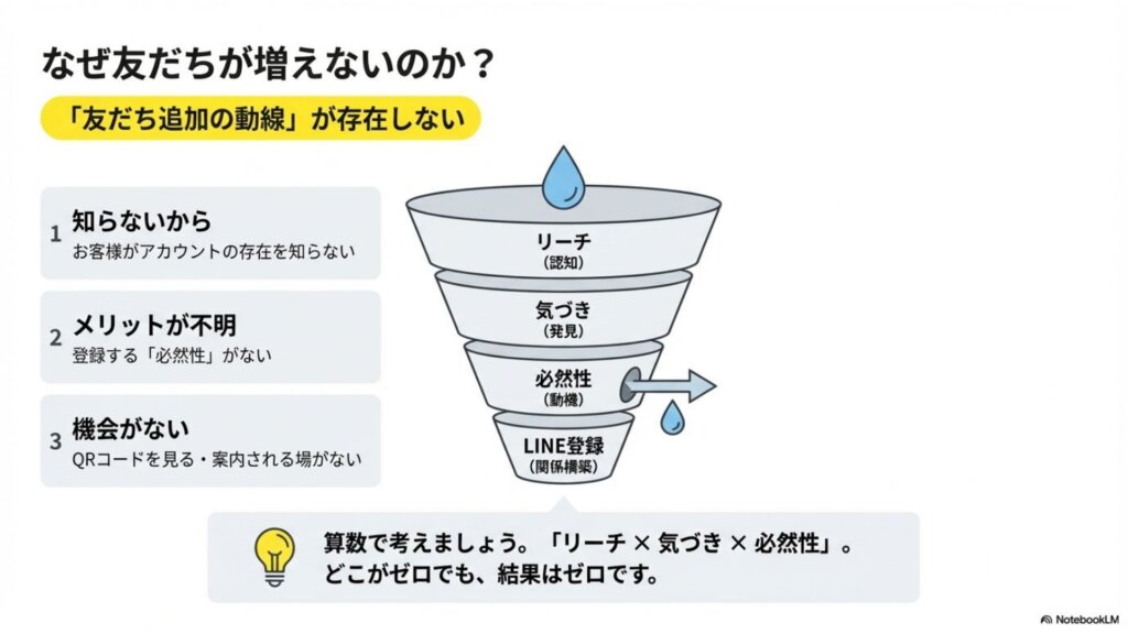 多くの飲食店が「QRコードを置いているだけ」で終わっています。友だち登録を増やすには、算数で考える必要があります。